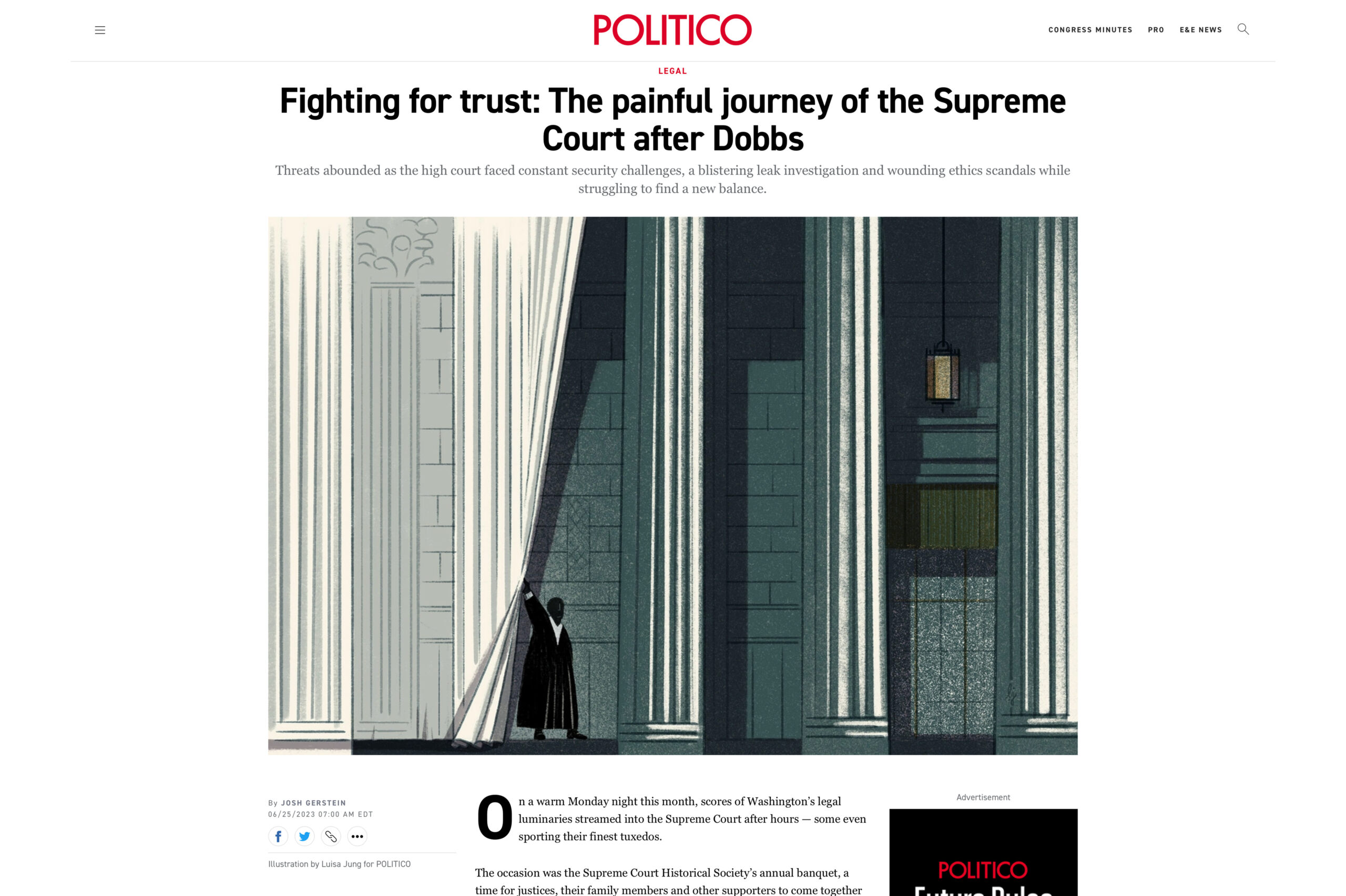 Illustration for an article about how, one year after the Dobbs decision that overturned the Roe vs. Wade ruling, the Supreme Court has become increasingly locked down, shielding itself from public scrutiny.